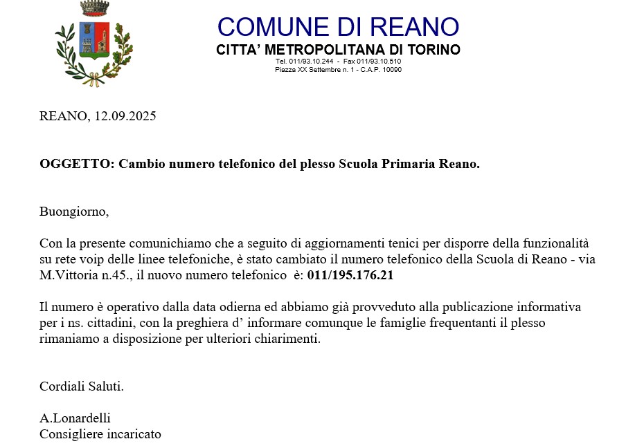 comunichiamo che a seguito di aggiornamenti tenici per disporre della funzionalità su rete voip delle linee telefoniche, è stato cambiato il numero telefonico della Scuola di Reano - via M.Vittoria n.45., il nuovo numero telefonico è: 011/195.176.21