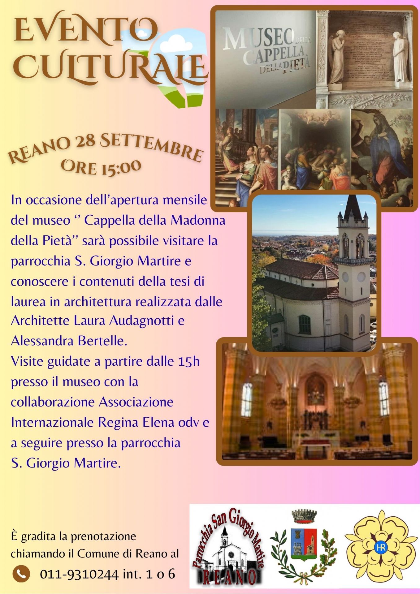 Visita guidata al museo ‘’ Cappella della Madonna della Pietà’’ e della parrocchia S. Giorgio Martire per conoscere i contenuti della tesi di laurea in architettura realizzata dalle Architette Laura Audagnotti e Alessandra Bertelle: ARCHITETTURA SACRA SULLA COLLINA MORENICA TRA LA VAL DI SUSA E LA VAL SANGONE La parrocchia di S. Giorgio – Reano