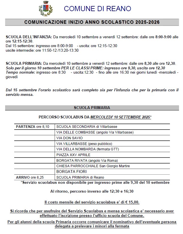 Comunicazione inizio scuola (circolare n.12 IC Trana) e servizi Infanzia e Primaria di Reano.