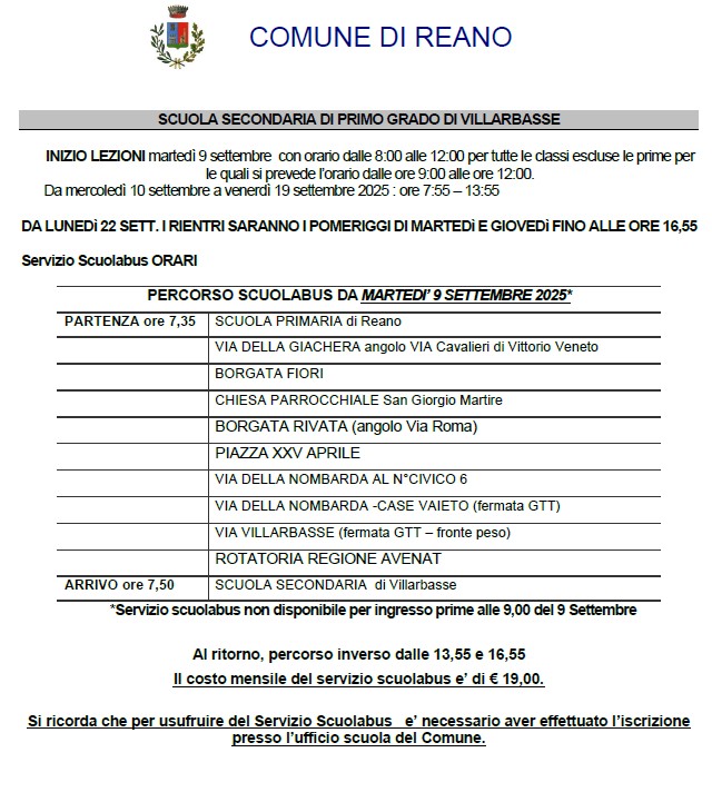 Comunicazione inizio scuola (circolare n.10 IC Gozzano) e servizi secondaria di Villarbasse.